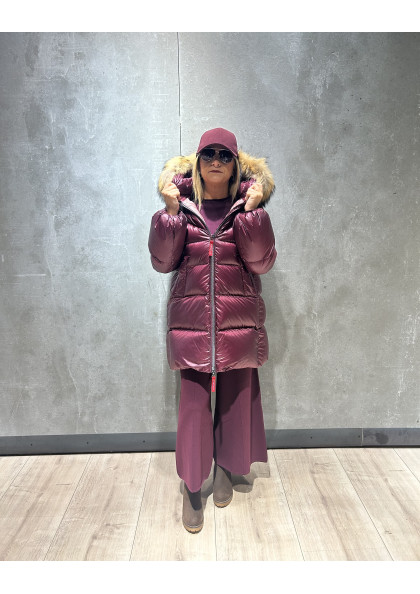 Plumífero largo de mujer. Cierre central con cremallera personalizada de doble carro y snaps. Bolsillos con cremalleras personalizadas....
