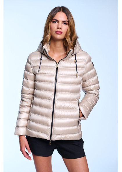 Plumífero corto de mujer. Cierre central con cremallera personalizada de doble carro. Bolsillos con cremallera personalizada. Capucha desmontable con visera y tiradores....