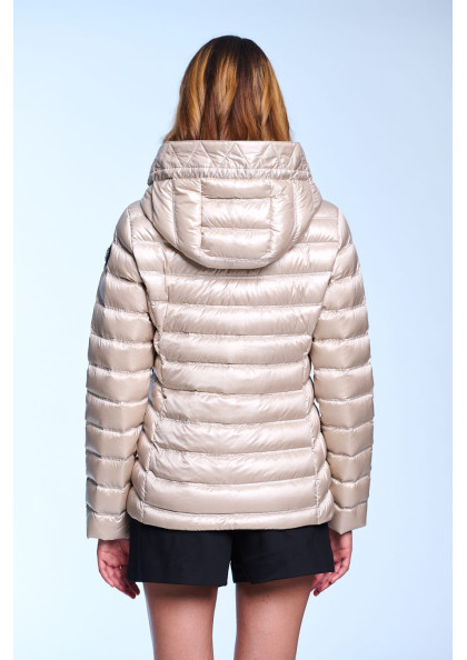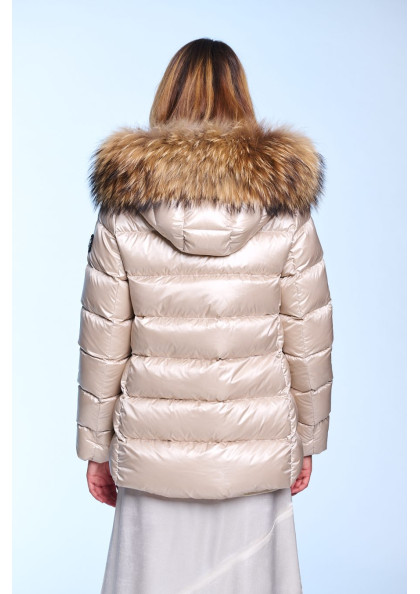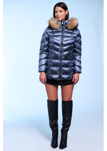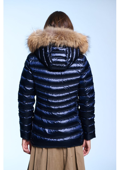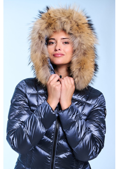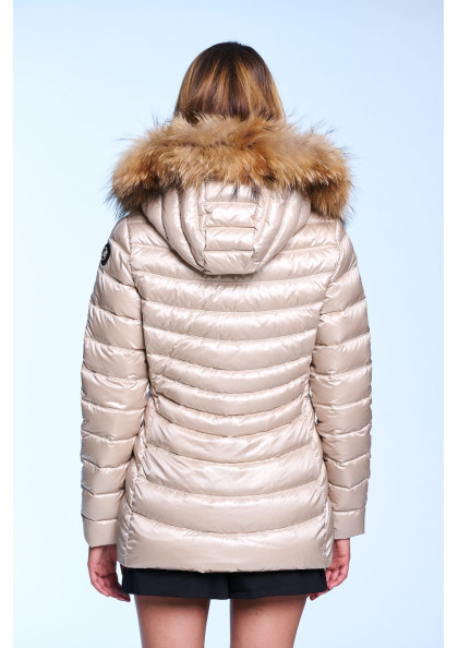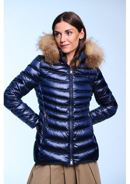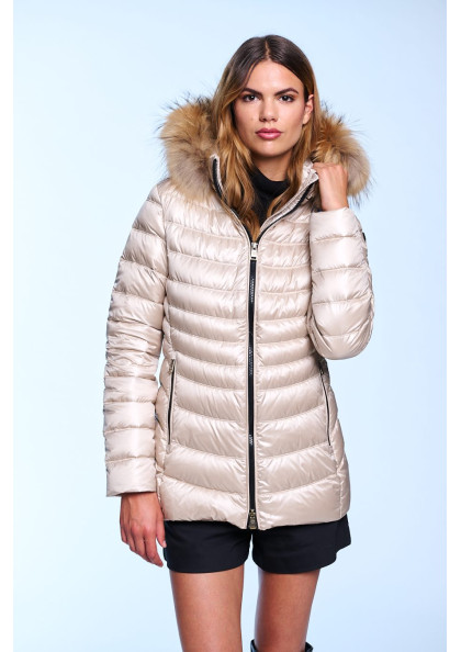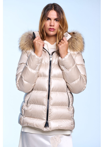 Plumífero corto de mujer. Cierre central con cremallera personalizada de doble carro. Bolsillos con cremalleras. Capucha desmontable con pelo natural. Tejido repelente al agua...