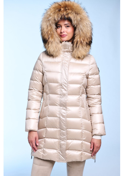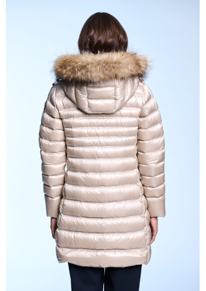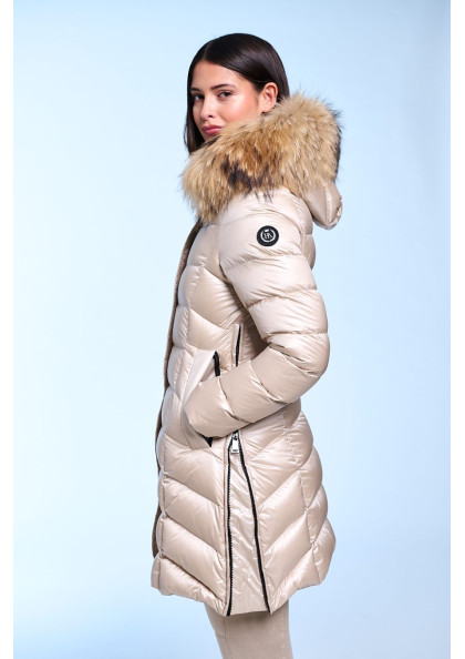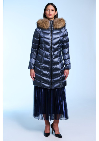 Plumífero largo de mujer de corte slim fit. Cierre central con cremallera personalizada de doble carro y snaps. Capucha desmontable con pelo natural desmontable. Bolsillos con...
