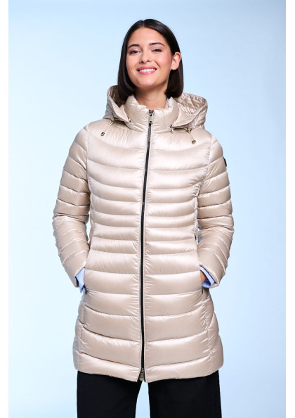 Plumífero largo de mujer. Cierre central con cremallera personalizada de doble carro. Capucha desmontable con visera y tiradores personalizados. Embolsable. Bolsillos...