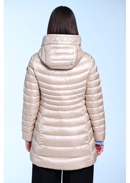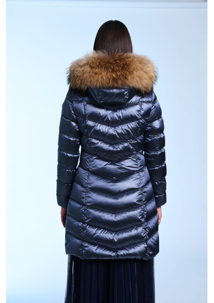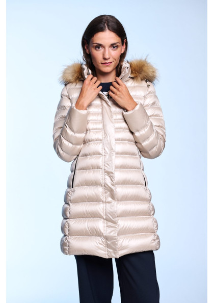 Plumífero largo de mujer de corte slim fit. Cierre central con cremallera personalizada de doble carro. Capucha fija con pelo natural desmontable. Bolsillo interior con...