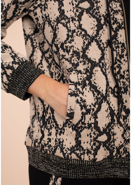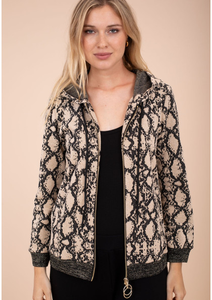 Añade estilo a tu look casual con esta chaqueta de corte cómodo y estampado tipo serpiente. Con capucha, cierre de cremallera y detalles en ribete elástico para un ajuste...