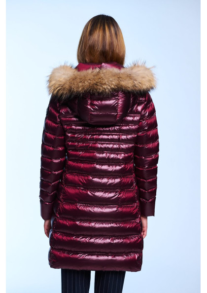 Plumífero largo de mujer. Cierre central con cremallera personalizada de doble carro y snaps. Bolsillos con cremalleras personalizadas. Capucha desmontable con pelo natural y...