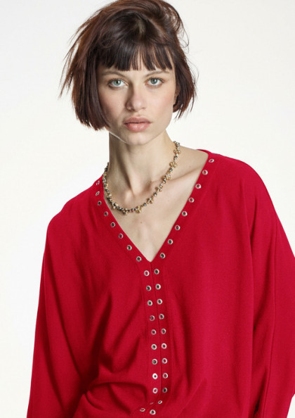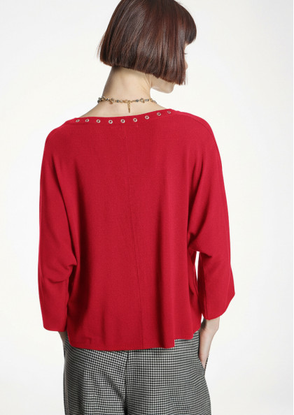 Jersey de punto fino en un bonito color rojo con ojales metálicos en cuello y dibujo central.