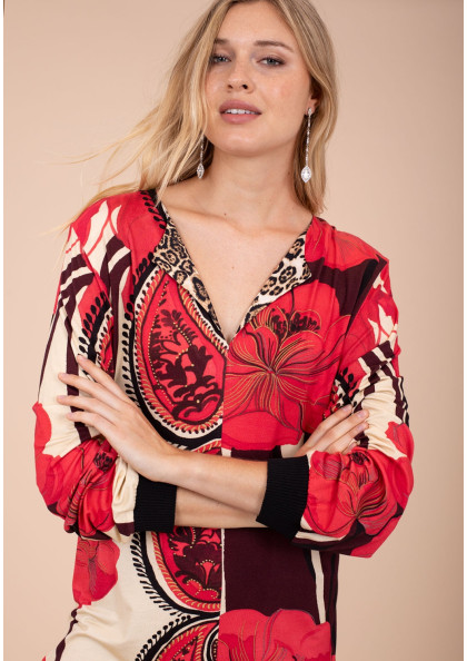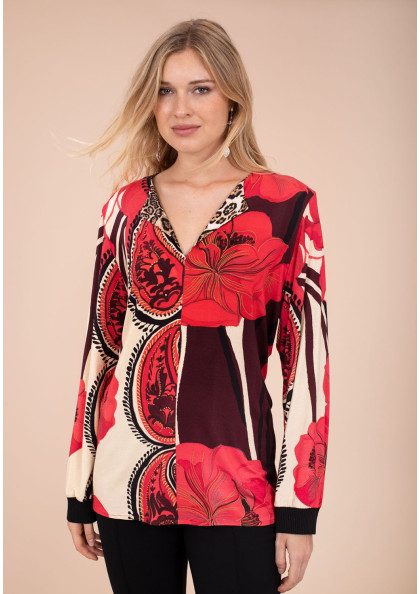 Blusa multicolor de manga larga. Escote en pico con detalle de estampado animal print en el cuello. Estampado floral y geométrico en tonos rojos, beige y burdeos. Puños de...