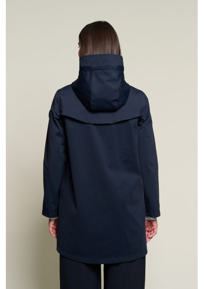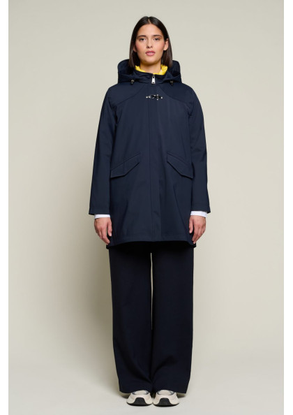 Parka larga de mujer con costuras termo selladas. Cierre central con cremallera de doble carro y mosquetón. Bolsillos con tapeta y cierre con snaps. Capucha desmontable con...