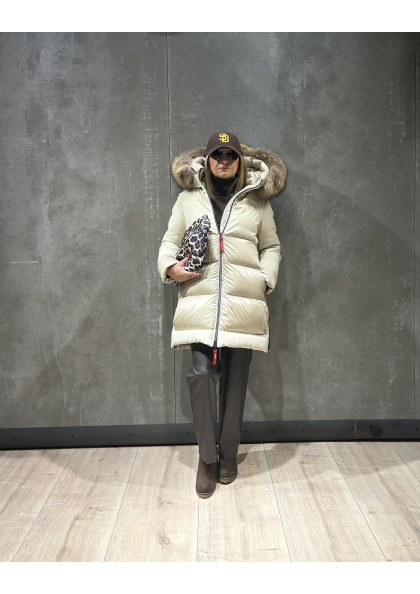 Cazadora de plumas RANDY 813 combina funcionalidad y estilo con su capucha en blanco que aporta un contraste elegante. El pelo de la capucha, que mezcla el tono principal de...