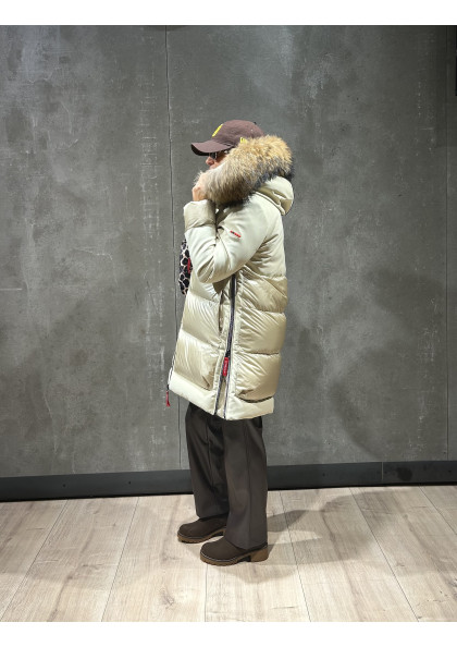 Plumífero STEFFIE con tejido combinado en mate y brillo. Tiene un elegante diseño, con largo por encima de la rodilla. Mangas estilo gabardina. Capucha con un espectacular...
