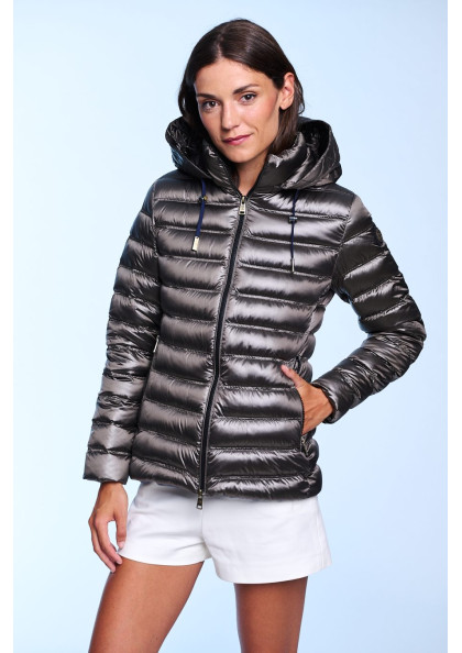 Plumífero corto de mujer. Cierre central con cremallera personalizada de doble carro. Bolsillos con cremallera personalizada. Capucha desmontable con visera y tiradores....