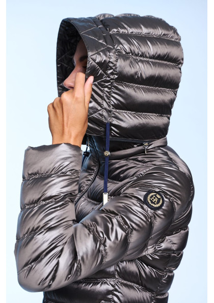 Plumífero largo de mujer. Cierre central con cremallera personalizada de doble carro. Capucha desmontable con visera y tiradores personalizados. Embolsable. Bolsillos...