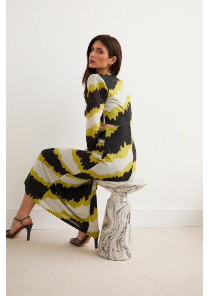 Vestido que combina la sofisticación de los detalles de flecos en contraste con un diseño minimalista a rayas. Escote a la caja, nuestro ya clásico alerón que tanto estiliza...