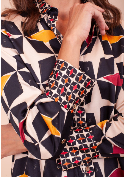 Blusa estampada estampado geométrico en negro, rojo y amarillo,  de manga larga. Cuello de solapa. Abrochada con botones en la parte delantera.