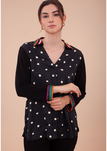 Camiseta negra de punto con estampado de topos. La parte delantera presenta un acabado sedoso y un elegante cuello con solapas. Las mangas largas y el cuello están rematados...