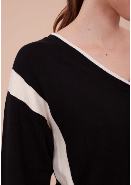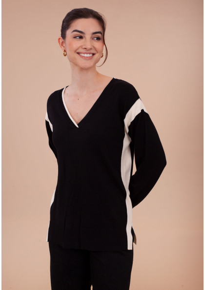 Jersey con cuello en V y rayas laterales blancas que estilizan la figura. Tejido fluido y suave al tacto, mezcla de viscosa y poliamida. Elegante, cómodo y versátil para...