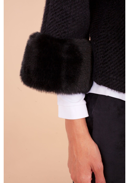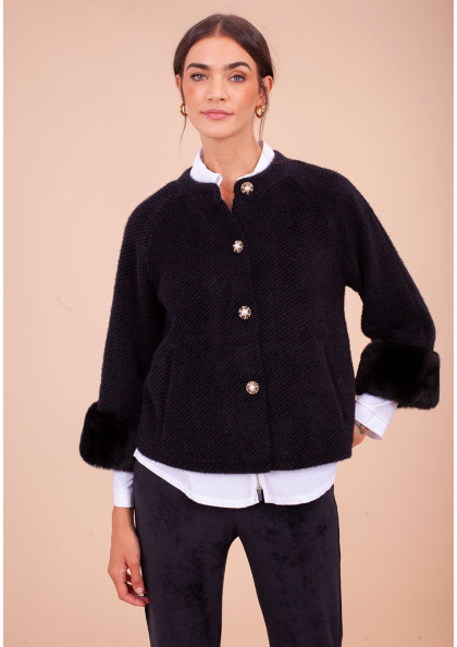 Elegante chaqueta en tejido suave y texturizado, con mangas tres cuartos y amplios puños vueltos de pelo. Su corte recto y el cuello redondo sin solapa le dan un estilo...