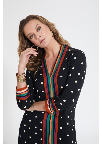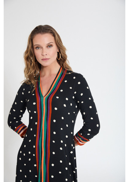 Vestido negro con estampado de topos, de punto, con cuello en pico. Mangas largas y cuello rematadas con detalles de rayas floreadas.
