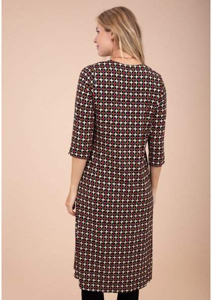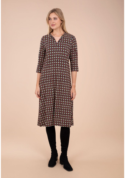 Vestido estampado geométrico en tonos negro, beige y rojo. Cuello en V. Manga tres cuartos. Largo midi.