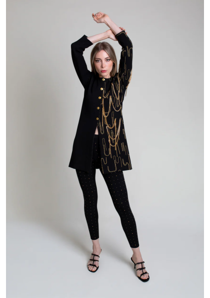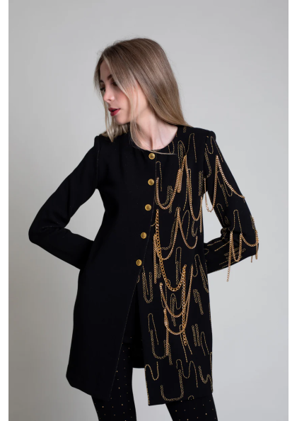 Abrigo de punto tricot con jacquar de cadenas en oro y adornos de cadena metálica. Modelo de corte encajado, cuello caja y manga larga. Cierre central con botones metálicos.