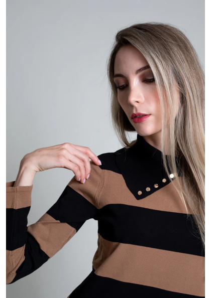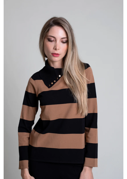 Jersey de punto tricot con rayas anchas bicolor. Modelo de corte recto con manga larga y falso cuello vuelto con adorno de botones metálicos.