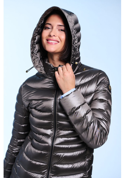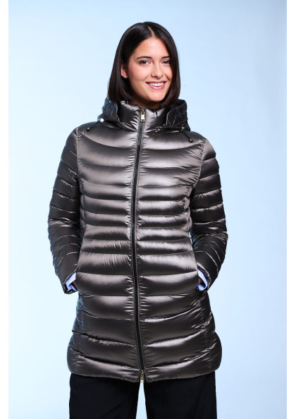 Plumífero largo de mujer. Cierre central con cremallera personalizada de doble carro. Capucha desmontable con visera y tiradores personalizados. Embolsable. Bolsillos...