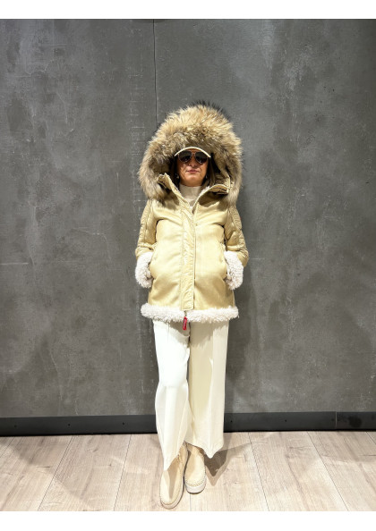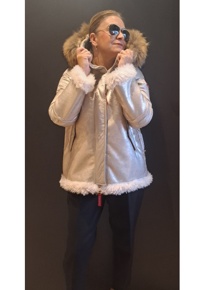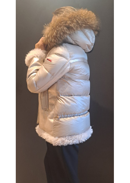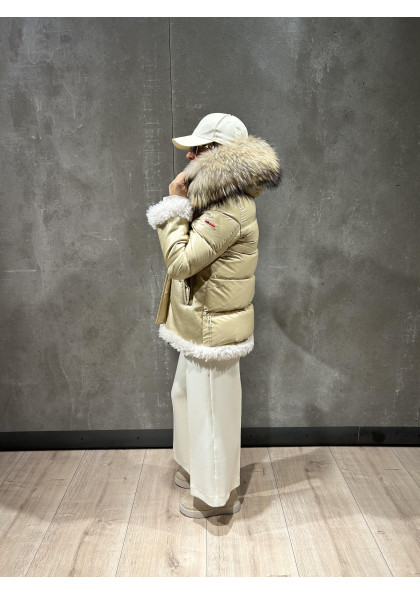 Plumífero corto de mujer. Cierre central con cremallera personalizada de doble carro. Bolsillos con cremalleras. Capucha desmontable con pelo natural. Tejido repelente al agua...
