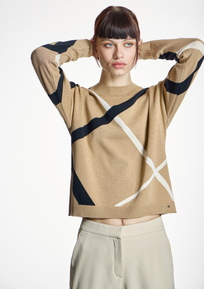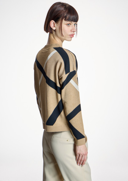 Chaqueta corta de punto tricot con estampado de cuadros, cuello solapa y manga larga. Corte recto con bolsillos de polipiel en delantero y cuello extraíble en bouclé marrón.