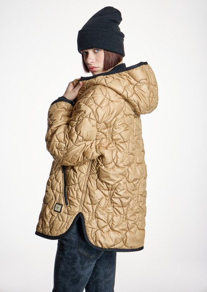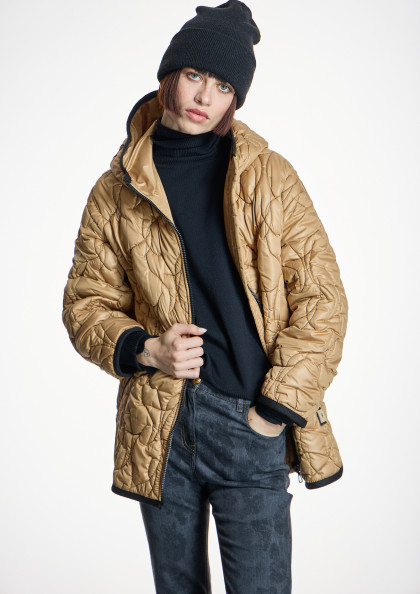 Parka acolchada camel con textura y capucha a juego con el ribete en negro.