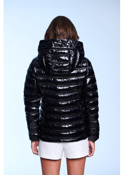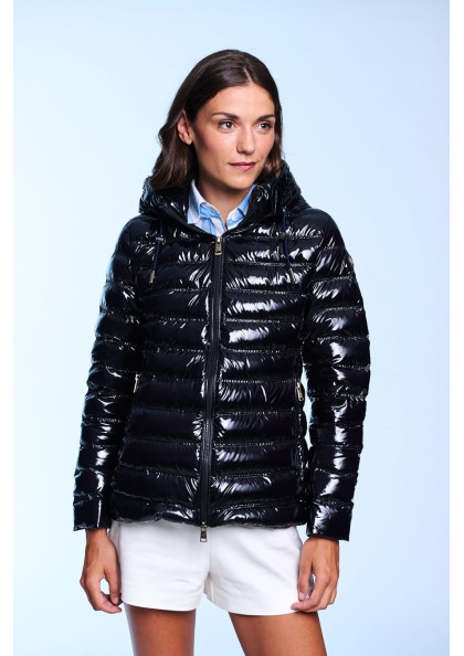 Plumífero corto de mujer. Cierre central con cremallera personalizada de doble carro. Bolsillos con cremallera personalizada. Capucha desmontable con visera y tiradores....