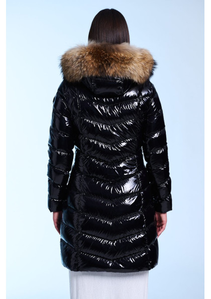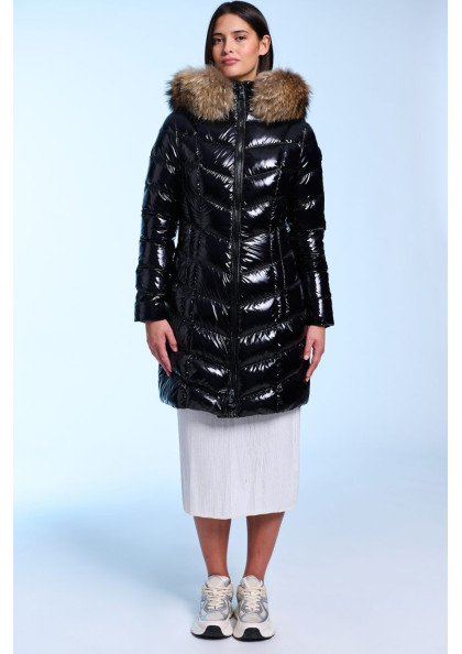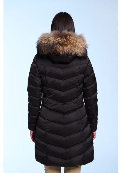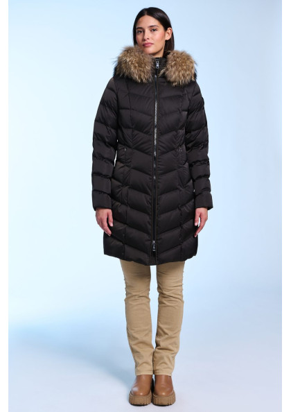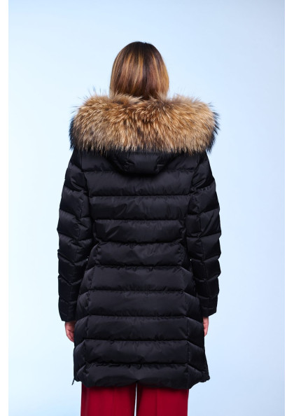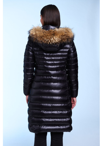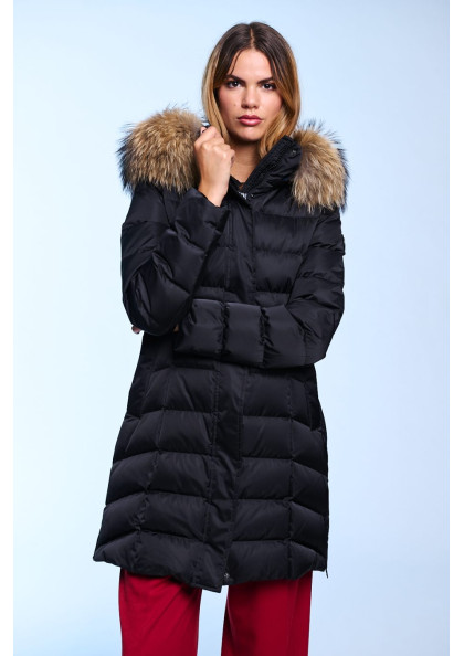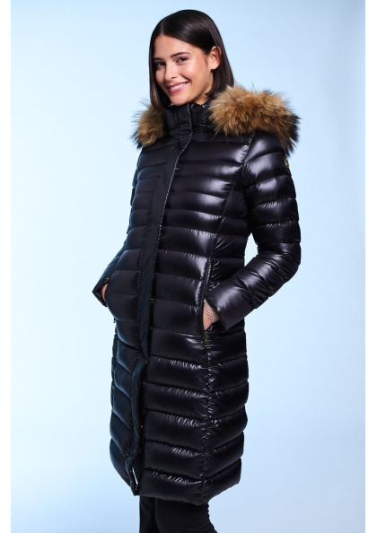 Plumífero largo de mujer de corte slim fit. Cierre central con cremallera personalizada de doble carro. Capucha fija con pelo natural desmontable. Bolsillo interior con...