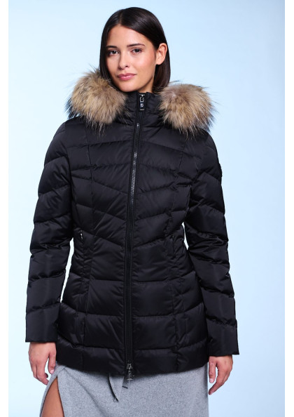 Plumífero corto de mujer confeccionado en “V” Cierre central con cremallera personalizada de doble carro. Bolsillos con cremalleras invisibles. Capucha fija con pelo natural...