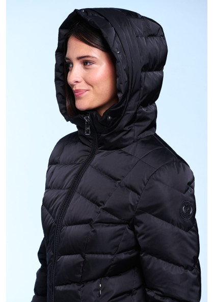 Plumífero largo de mujer de corte slim fit. Cierre central con cremallera personalizada de doble carro y cierre con snaps. Bolsillos con cremallera. Capucha desmontable con...