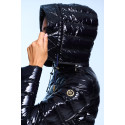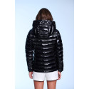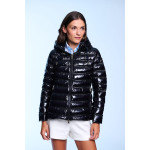 Plumífero corto de mujer. Cierre central con cremallera personalizada de doble carro. Bolsillos con cremallera personalizada. Capucha desmontable con visera y tiradores. Tejido repelente al agua y cortavientos. Relleno de plumón termorregulador.  Capucha desmontable. Embolsable. 90% Plumón y 10% Pluma.