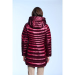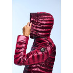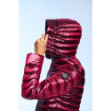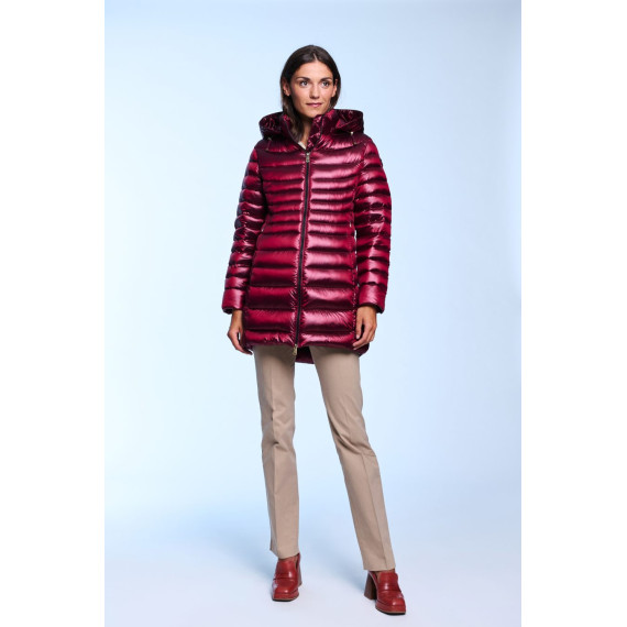 Plumífero largo de mujer. Cierre central con cremallera personalizada de doble carro. Capucha desmontable con visera y tiradores personalizados. Embolsable. Bolsillos laterales con cremalleras invisibles. Tejido repelente al agua y cortavientos. Relleno de plumón termorregulador.