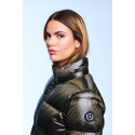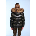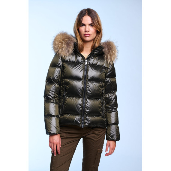 Plumífero corto de mujer. Cierre central con cremallera personalizada de doble carro. Bolsillos con cremalleras personalizadas. Capucha desmontable con pelo natural desmontable y tiradores. Repelente al agua y cortavientos. Relleno de plumón termorregulador. 90% Plumón y 10% Pluma