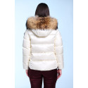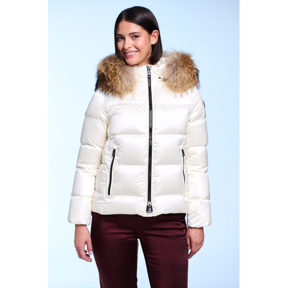 Plumífero corto de mujer. Cierre central con cremallera personalizada de doble carro. Bolsillos con cremalleras personalizadas. Capucha desmontable con pelo natural desmontable y tiradores. Repelente al agua y cortavientos. Relleno de plumón termorregulador. 90% Plumón y 10% Pluma