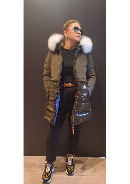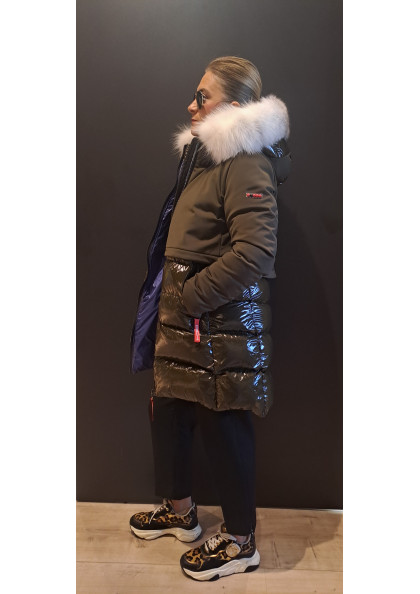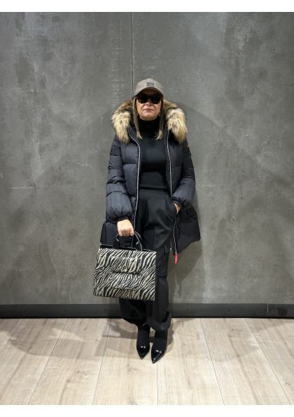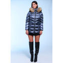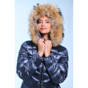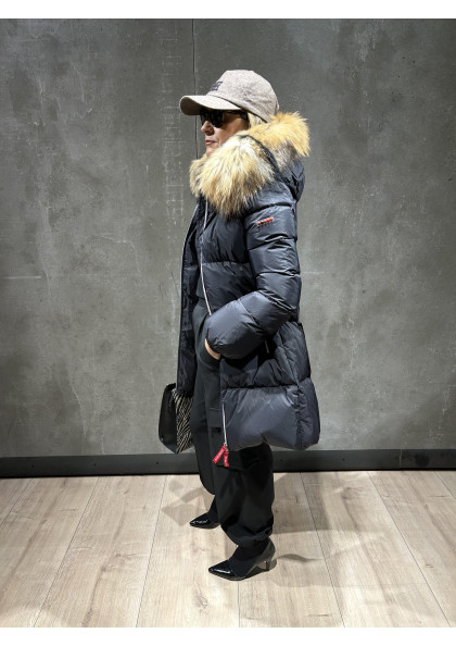 Plumífero corto de mujer confeccionado en “V” Cierre central con cremallera personalizada de doble carro. Bolsillos con cremalleras invisibles. Capucha fija con pelo natural desmontable. Bolsillo interior con cremallera invisible. Tejido repelente al agua y cortavientos. Relleno de plumón termorregulador.