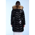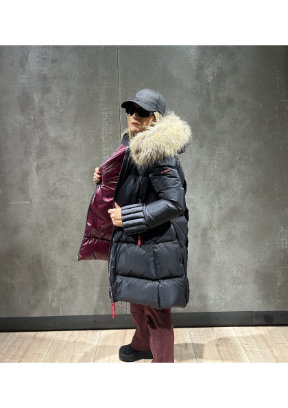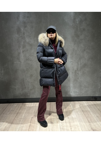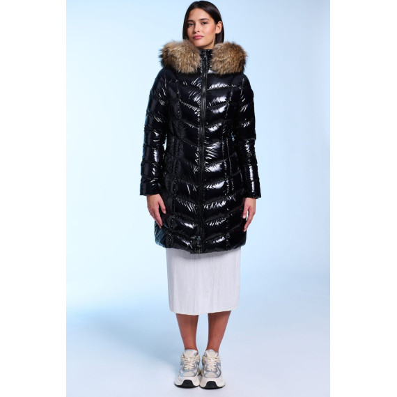 Plumífero largo de mujer de corte slim fit. Cierre central con cremallera personalizada de doble carro. Capucha fija con pelo natural desmontable. Bolsillo interior con cremallera invisible. Repelente al agua y cortavientos. Relleno de plumón termorregulador.