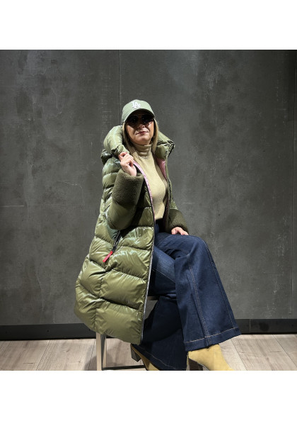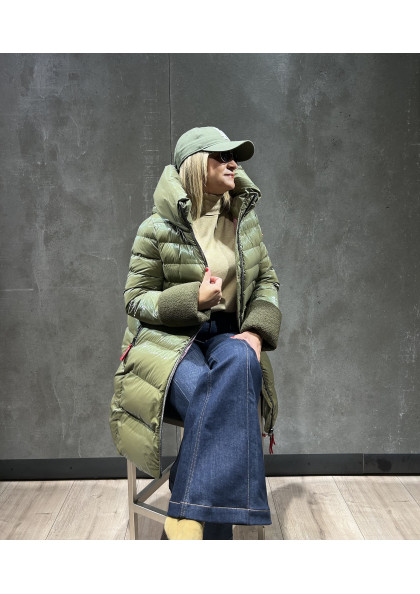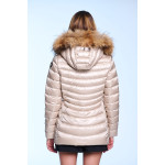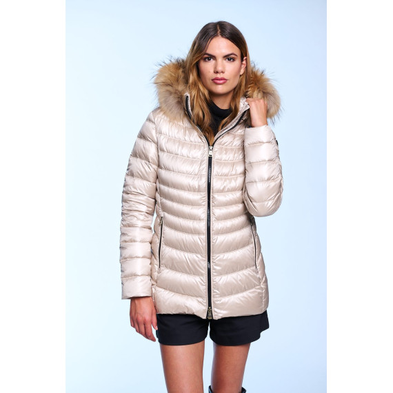 Plumífero corto de mujer. Cierre central con cremallera personalizada de doble carro. Bolsillos con cremalleras. Capucha desmontable con pelo natural. Tejido repelente al agua y cortavientos. Relleno de plumón termorregulador.