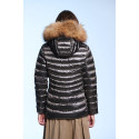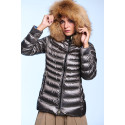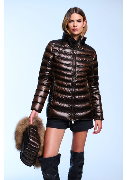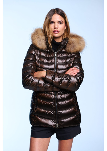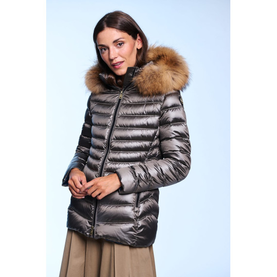 Plumífero corto de mujer. Cierre central con cremallera personalizada de doble carro. Bolsillos con cremalleras. Capucha desmontable con pelo natural. Tejido repelente al agua y cortavientos. Relleno de plumón termorregulador.