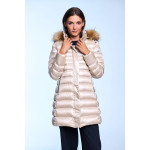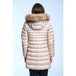 Plumífero largo de mujer. Cierre central con cremallera personalizada de doble carro y snaps. Bolsillos con cremalleras personalizadas. Capucha desmontable con pelo natural y tiradores. Tejido repelente al agua y cortavientos. Relleno de plumón termorregulador.