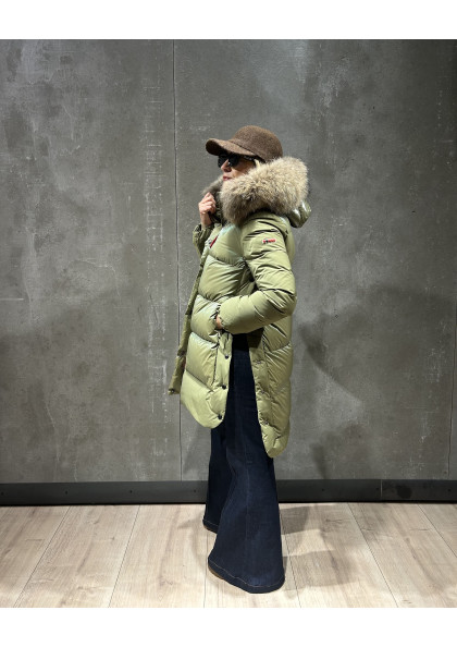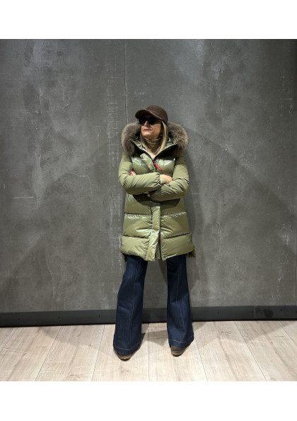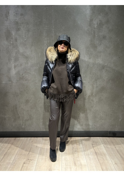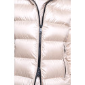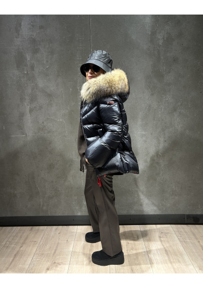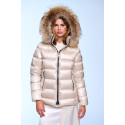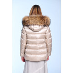 Plumífero corto de mujer. Cierre central con cremallera personalizada de doble carro. Capucha desmontable con pelo natural desmontable. Bolsillos con cremallera. Tejido repelente al agua y cortavientos. Relleno de plumón termorregulador.