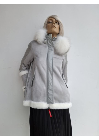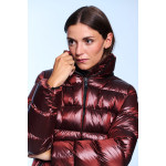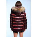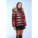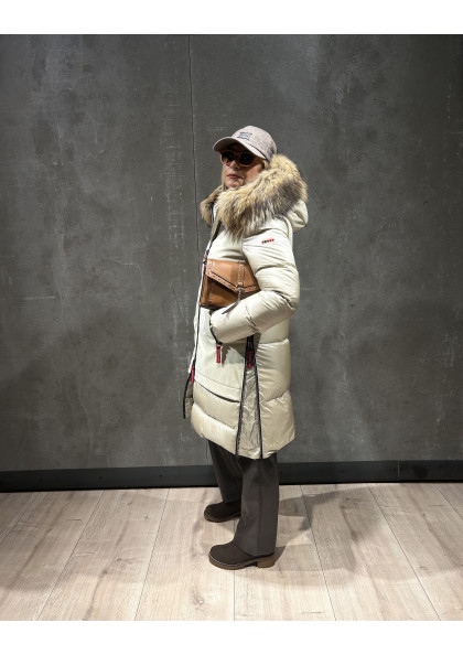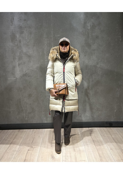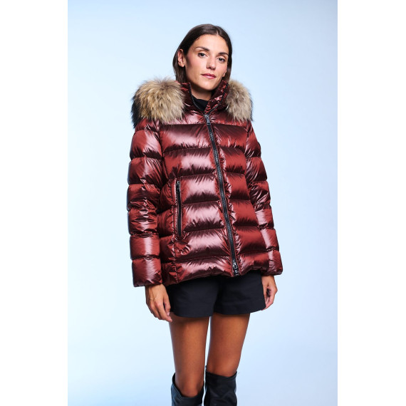 Plumífero corto de mujer. Cierre central con cremallera personalizada de doble carro. Capucha desmontable con pelo natural desmontable. Bolsillos con cremallera. Tejido repelente al agua y cortavientos. Relleno de plumón termorregulador.
