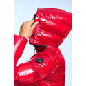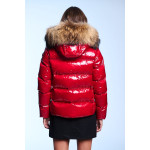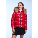 Plumífero corto de mujer. Cierre central con cremallera personalizada de doble carro. Bolsillos con cremalleras personalizadas. Capucha desmontable con pelo natural desmontable y tiradores. Repelente al agua y cortavientos. Relleno de plumón termorregulador.  90% Plumón y 10% Pluma