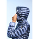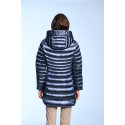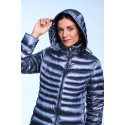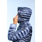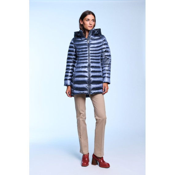 Plumífero largo de mujer. Cierre central con cremallera personalizada de doble carro. Capucha desmontable con visera y tiradores personalizados. Embolsable. Bolsillos laterales con cremalleras invisibles. Tejido repelente al agua y cortavientos. Relleno de plumón termorregulador.