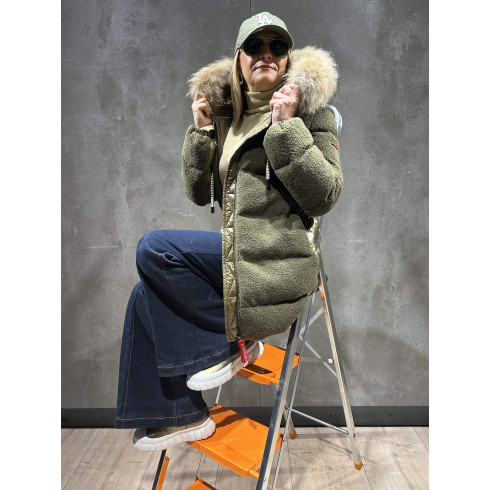 El plumífero ZOE combina la suavidad del borreguillo con un tejido brillante que aporta un toque actual. Su capucha integrada, que une ambos materiales, está adornada con pelo natural, ofreciendo calidez y un acabado exclusivo. Este diseño experto asegura confort y estilo en cada uso.