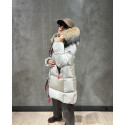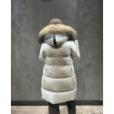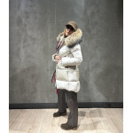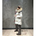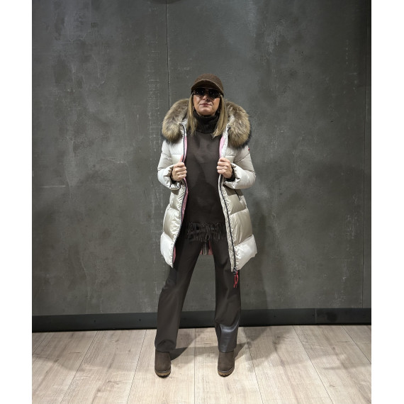 Plumífero STEFFIE con tejido combinado en mate y brillo. Tiene un elegante diseño, con largo por encima de la rodilla. Mangas estilo gabardina. Capucha con un espectacular pelo al tono. Cierre central con cremallera de doble carro.