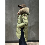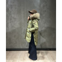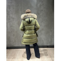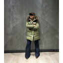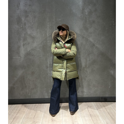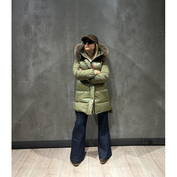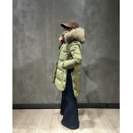 ASHERA plumas que destaca por su combinación única de tejidos con acabado brillante y mate, que aporta un elegante contraste visual. Aperturas laterales con botones. Su capucha está adornada con pelo original a tono, complementada por franjas blancas y negras que realzan su diseño sofisticado. Ideal para quienes buscan una prenda con estilo y personalidad en cada detalle.
