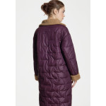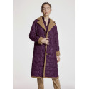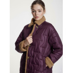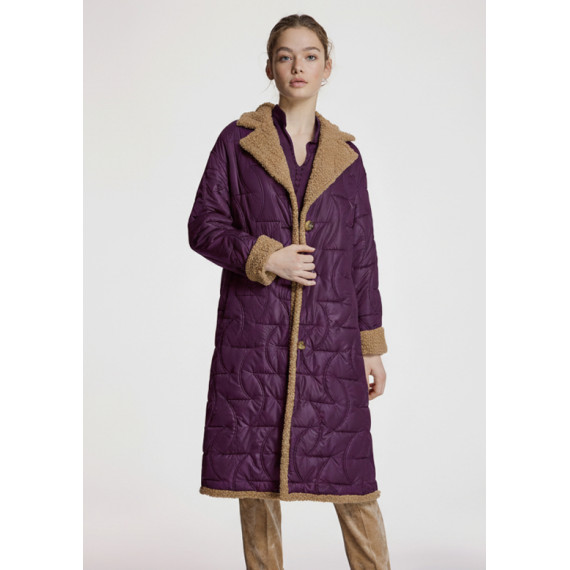 Abrigo acolchado con un bonito dibujo geométrico en color burdeos. Cuello solapa y puños de borreguillo en color camel.
