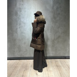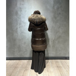 Plumífero STEFFIE con tejido combinado en mate y brillo. Tiene un elegante diseño, con largo por encima de la rodilla. Mangas estilo gabardina. Capucha con un espectacular pelo al tono. Cierre central con cremallera de doble carro.